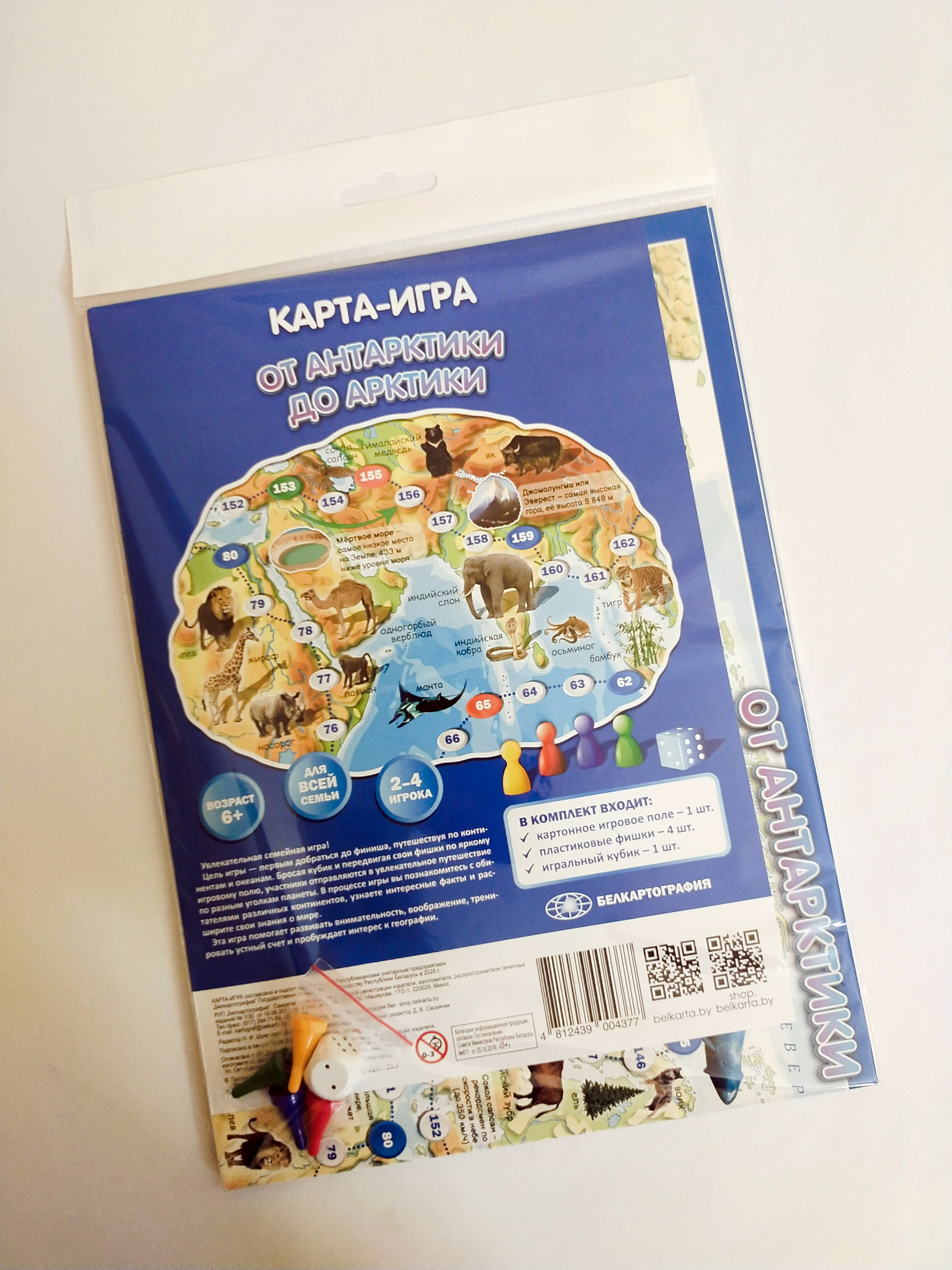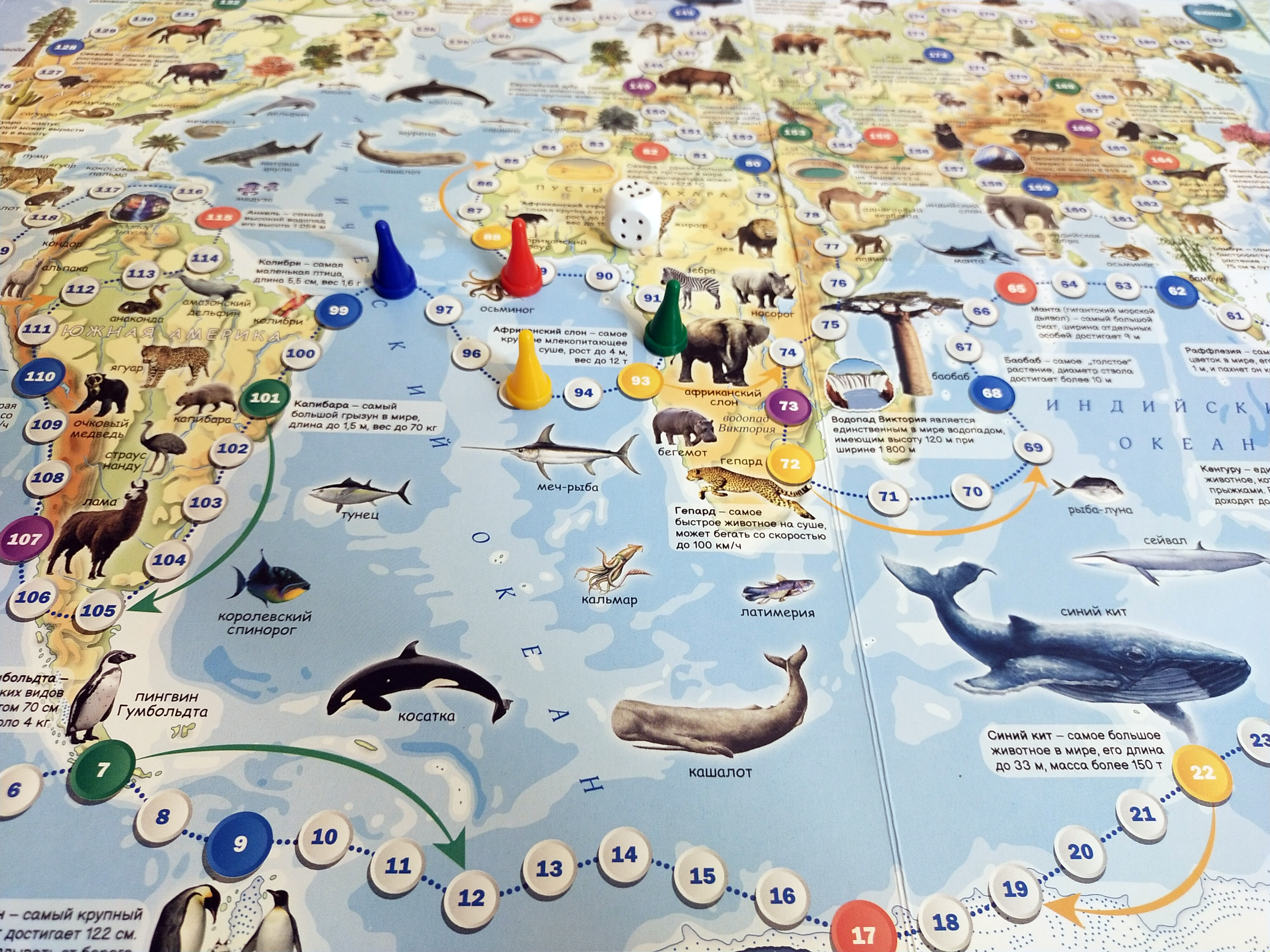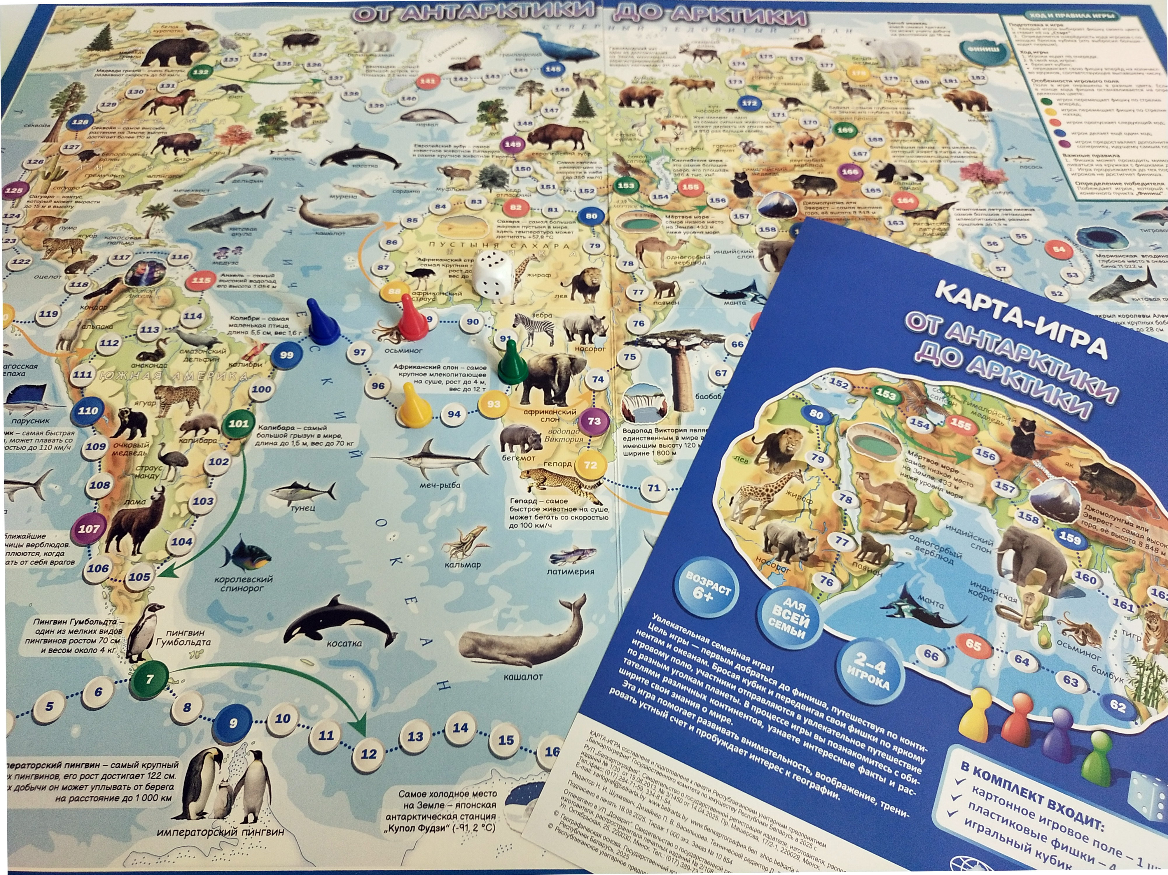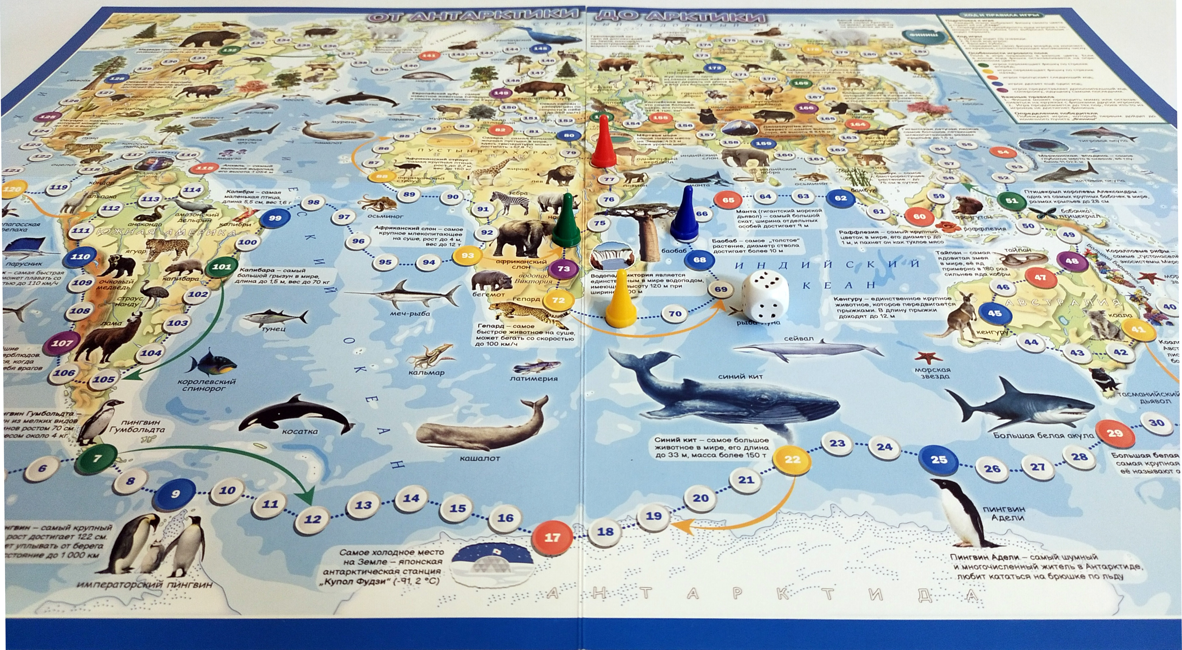 В комплект карты входит игровое поле, 4 пластиковые фишки и игральный кубик.
