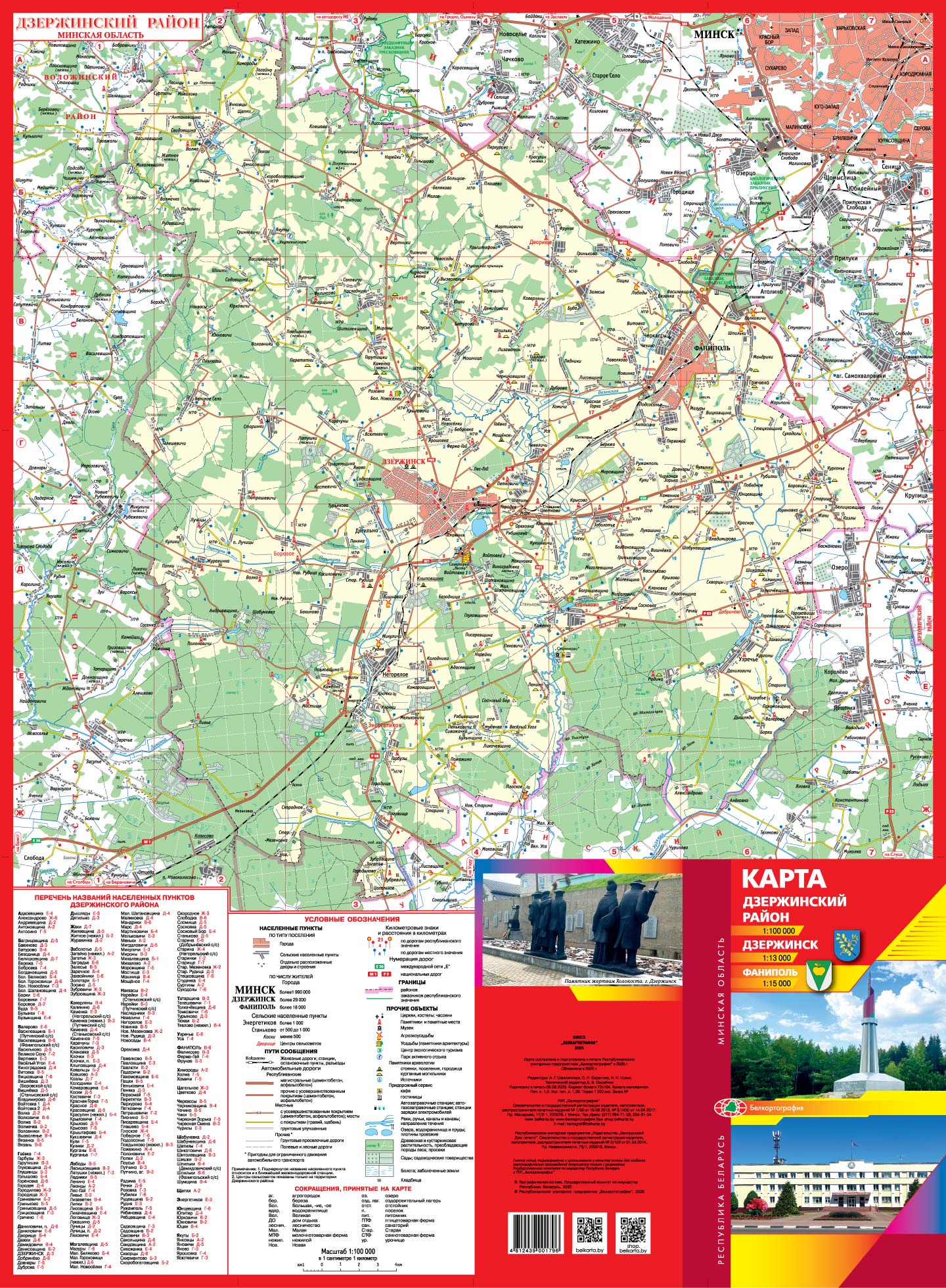 На одной стороне издания вы найдете подробную карту Дзержинского района, на которой обозначены гидрография, населенные пункты (с указанием центров сельсоветов), пути сообщения, растительность и достопримечательности. На другой стороне расположен подробный план Фаниполя и Дзержинска с указанием названий улиц, нумерацией домов. Обозначены все значимые объекты инфраструктуры и достопримечательности.