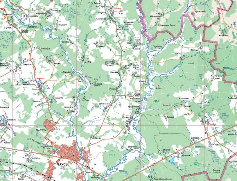 На одной стороне издания расположен подробный план города в масштабе 1:10 000, на другой стороне – карта Чаусского района в масштабе 1:100 000, на которой показаны населенные пункты, гидрография, пути сообщения, растительность, основные достопримечательности и объекты инфраструктуры.