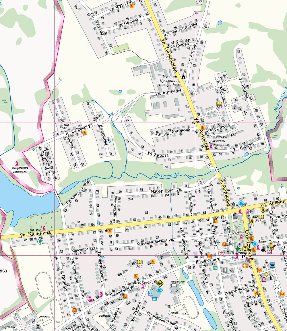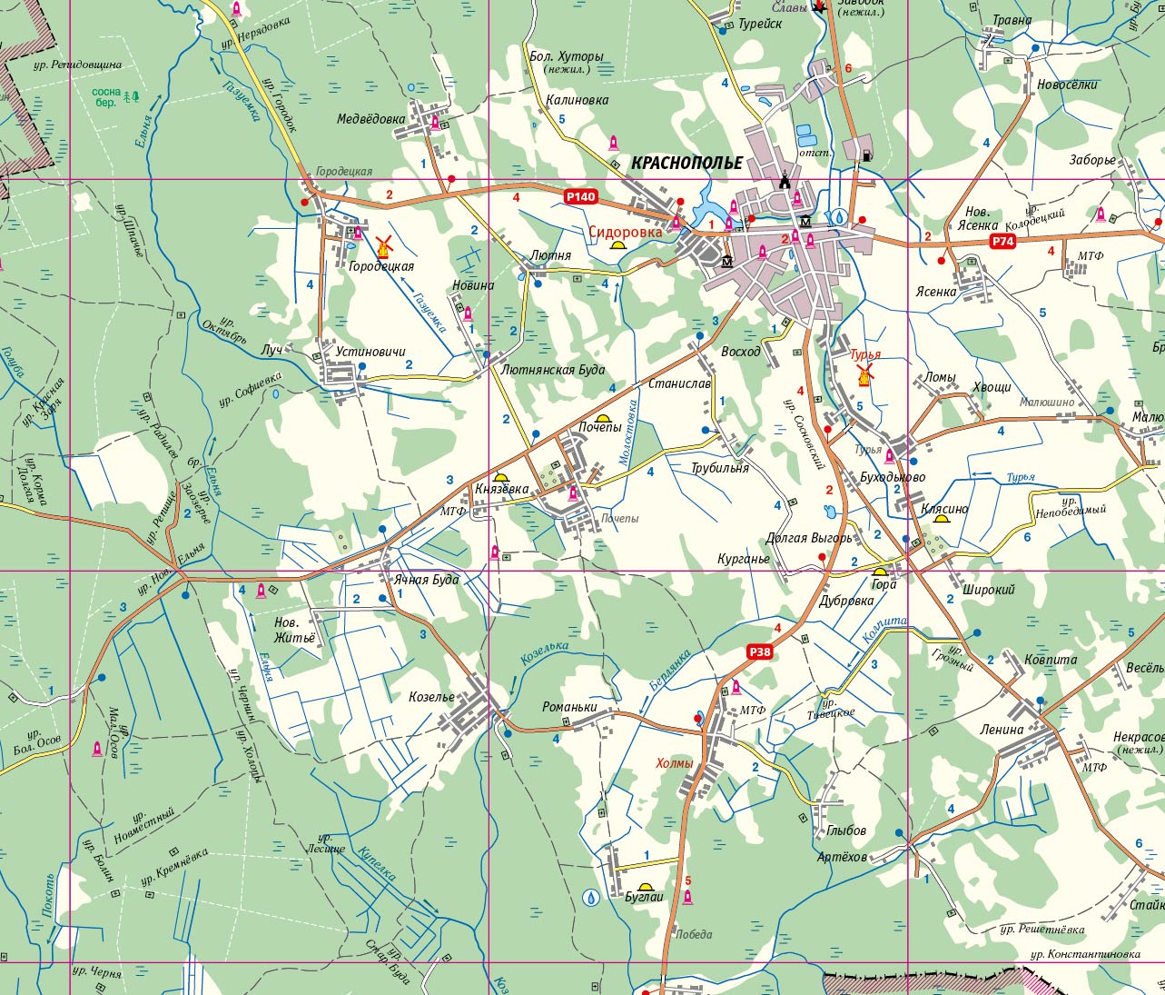 На другой стороне издания расположен подробный план Краснополья с указанием названий улиц, нумерацией домов. Обозначены все значимые объекты инфраструктуры поселка городского типа и достопримечательности.