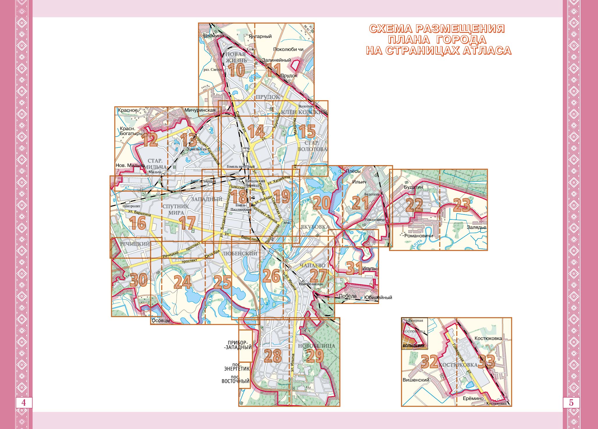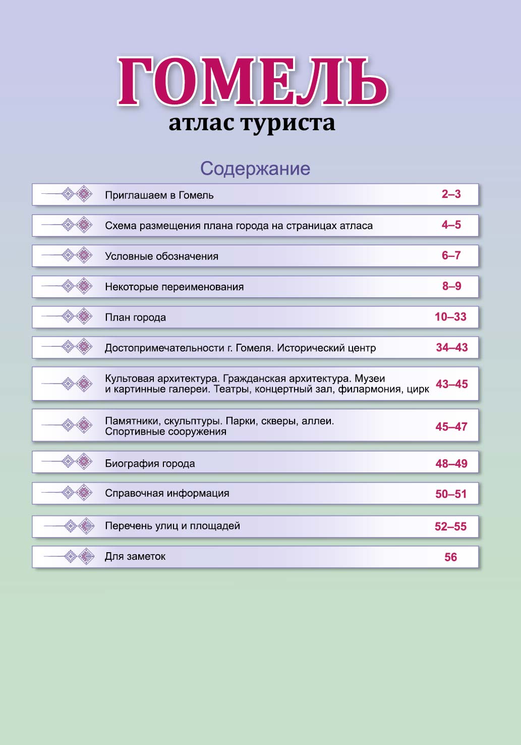 Помимо подробного плана Гомеля, атлас содержит справочную информацию об архитектуре города, памятниках, скульптурах, его музеях, театрах, концертных залах, филармонии, а также о спортивных сооружениях и других местах, которые могут быть интересными туристам.